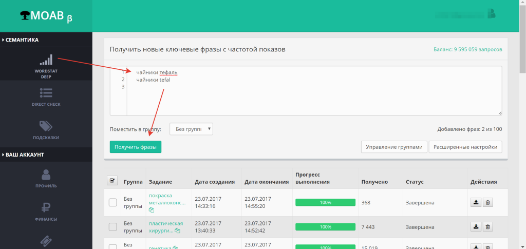 На данный момент модуль Wordstat Deep 2.0 сервиса MOAB Tools является, вероятно, самым быстрым парсером семантики среди публично представленных сервисов.