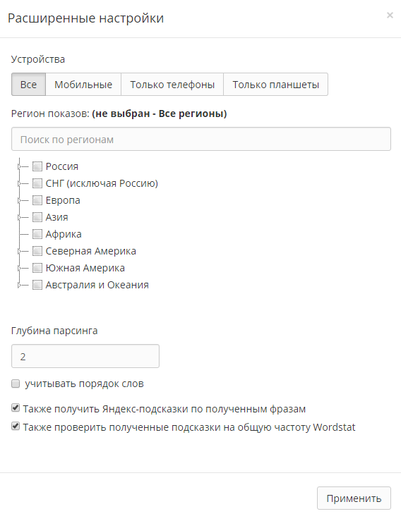 Настройки, при которых выполнено задание: регион сбора - весь мир; собираем все фразы из Wordstat, содержащие “купить” на глубину “2”, Яндекс-подсказки не собираем